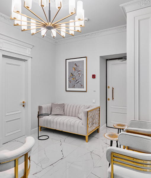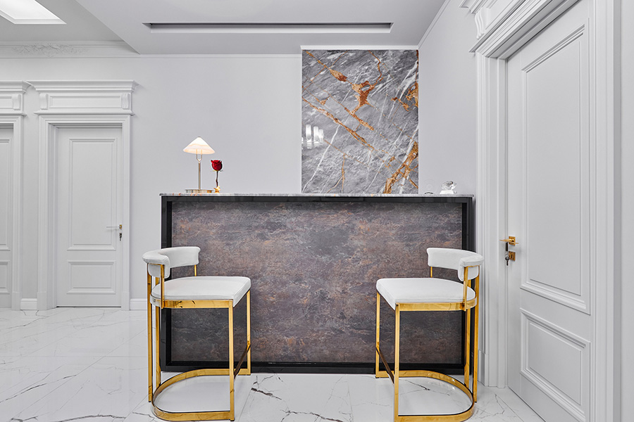 Изюминкой интерьера стала декоративная стена за стойкой ресепшн, которая привлекает внимание своим эффектным дизайном. Облицовка поверхности выполнена из крупноформатного керамогранита от итальянской фабрики IMOLA. На стене представлен керамогранит с паттерном под мрамор серого цвета с яркими золотыми прожилками, что добавляет пространству роскоши и утонченности. Пол также выложен керамогранитом с паттерном под мрамор, что создаёт ощущение единства и целостности всего интерьера. Благодаря таким решениям, клиника Laguna VIP не только функциональна, но и эстетически привлекательна, что способствует положительному восприятию посетителей с первых минут нахождения в ней.