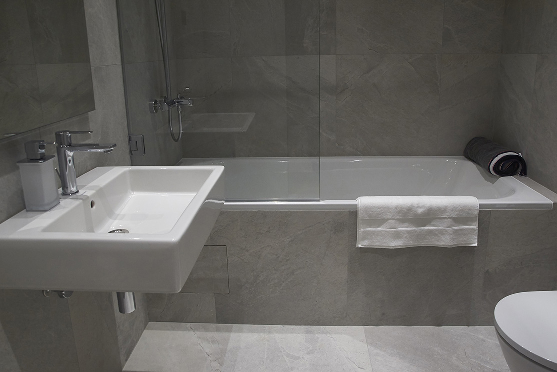 Дизайн апартаментов выполнен в современном и неоклассическом стилях, каждый из которых реализован в двух цветовых гаммах. Для санузлов в апартаментах используется керамогранит IMOLA. Керамогранит представлен в крупноформатных плитах с паттерном под мрамор светлого и темного оттенков. Такой выбор материала подчеркивает изысканность и стильность интерьера, создавая ощущение роскоши и комфорта.